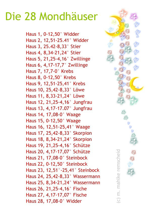 Noch eine Anmerkung. Finden Sie zum Beispiel „Haus 3, 25.42-8,34° Stier“, dann bedeutet dies, der Mond kommt aus 25.42° Widder und die Phase gilt bis 8,34° Stier.